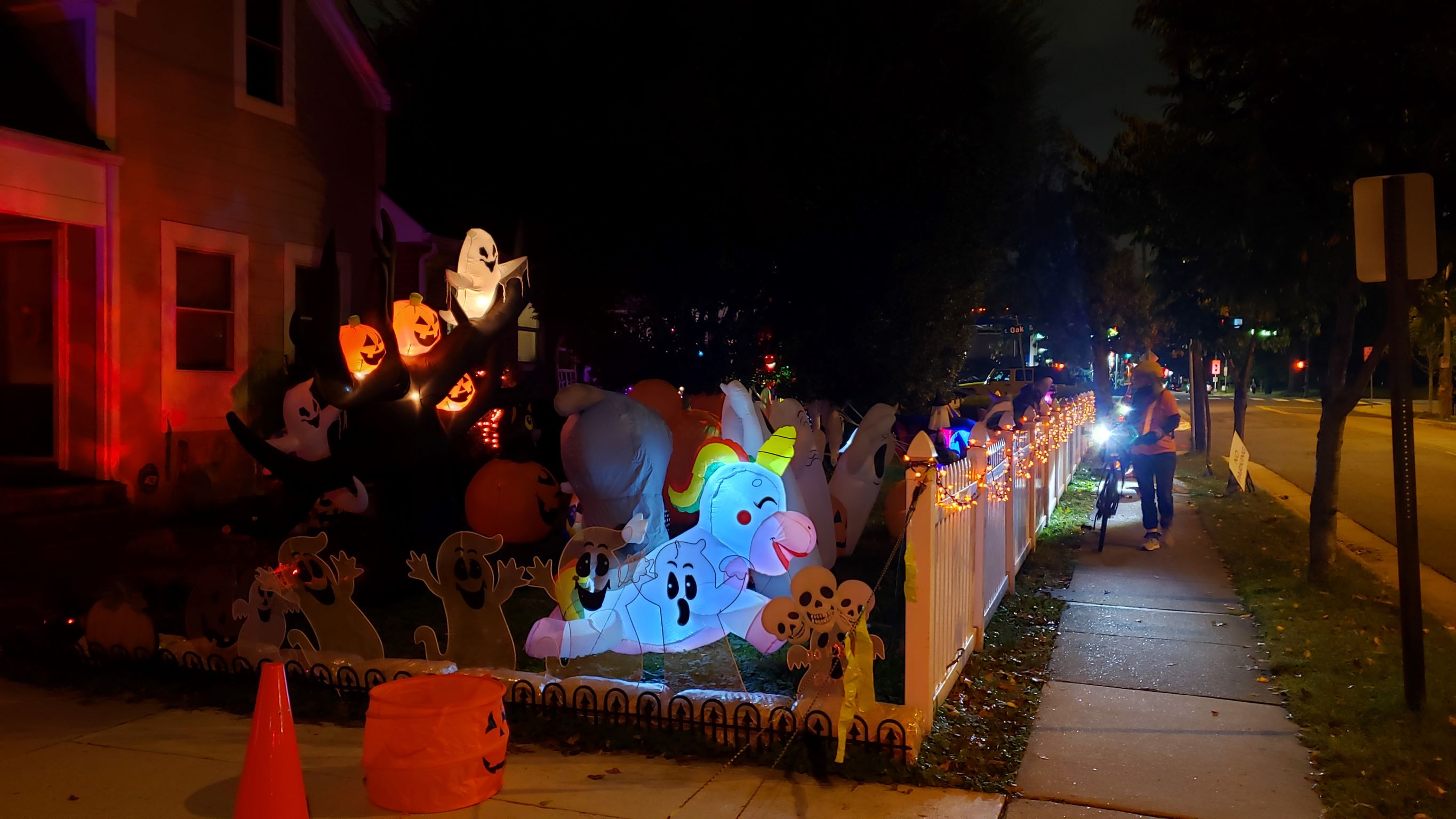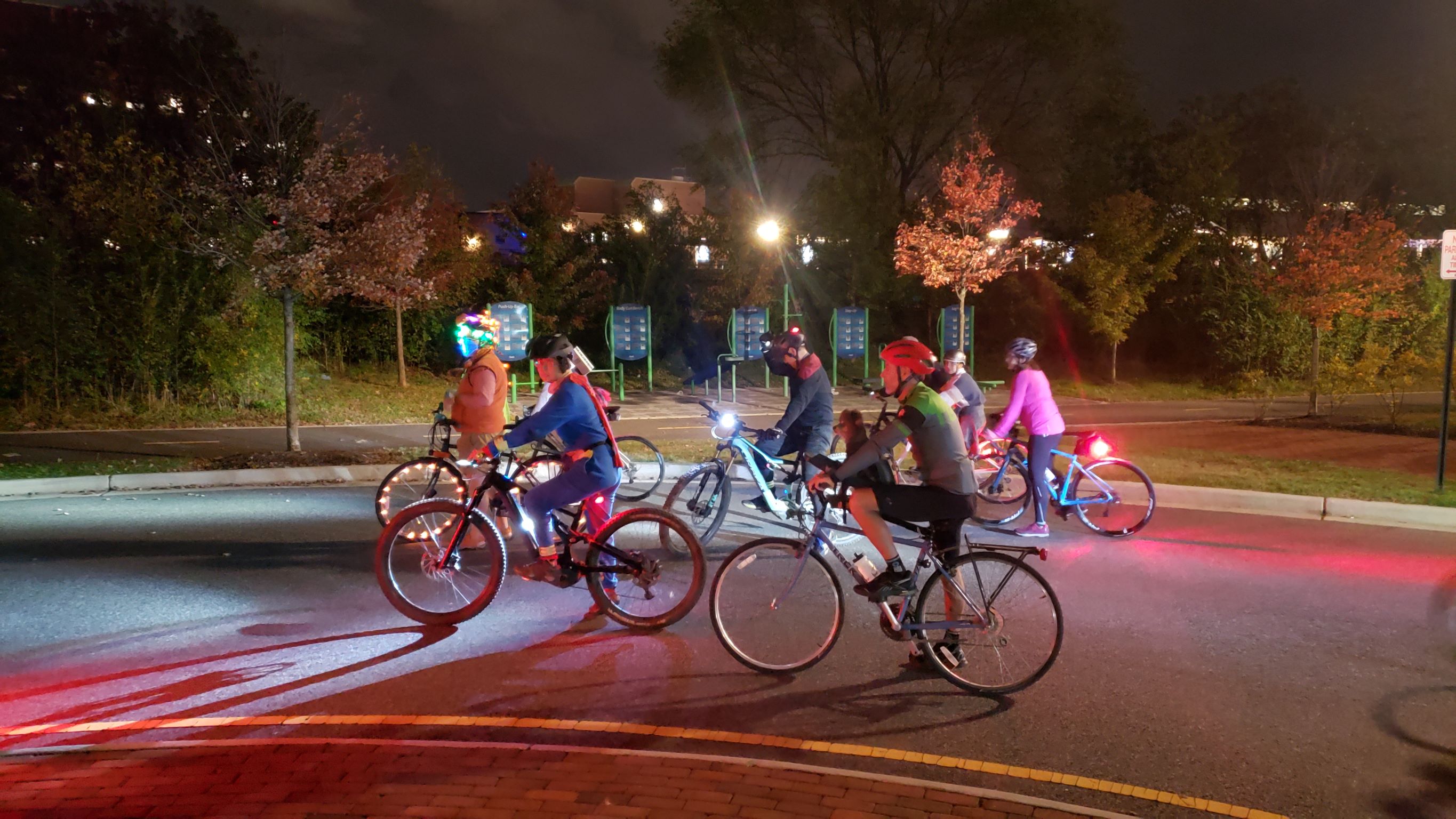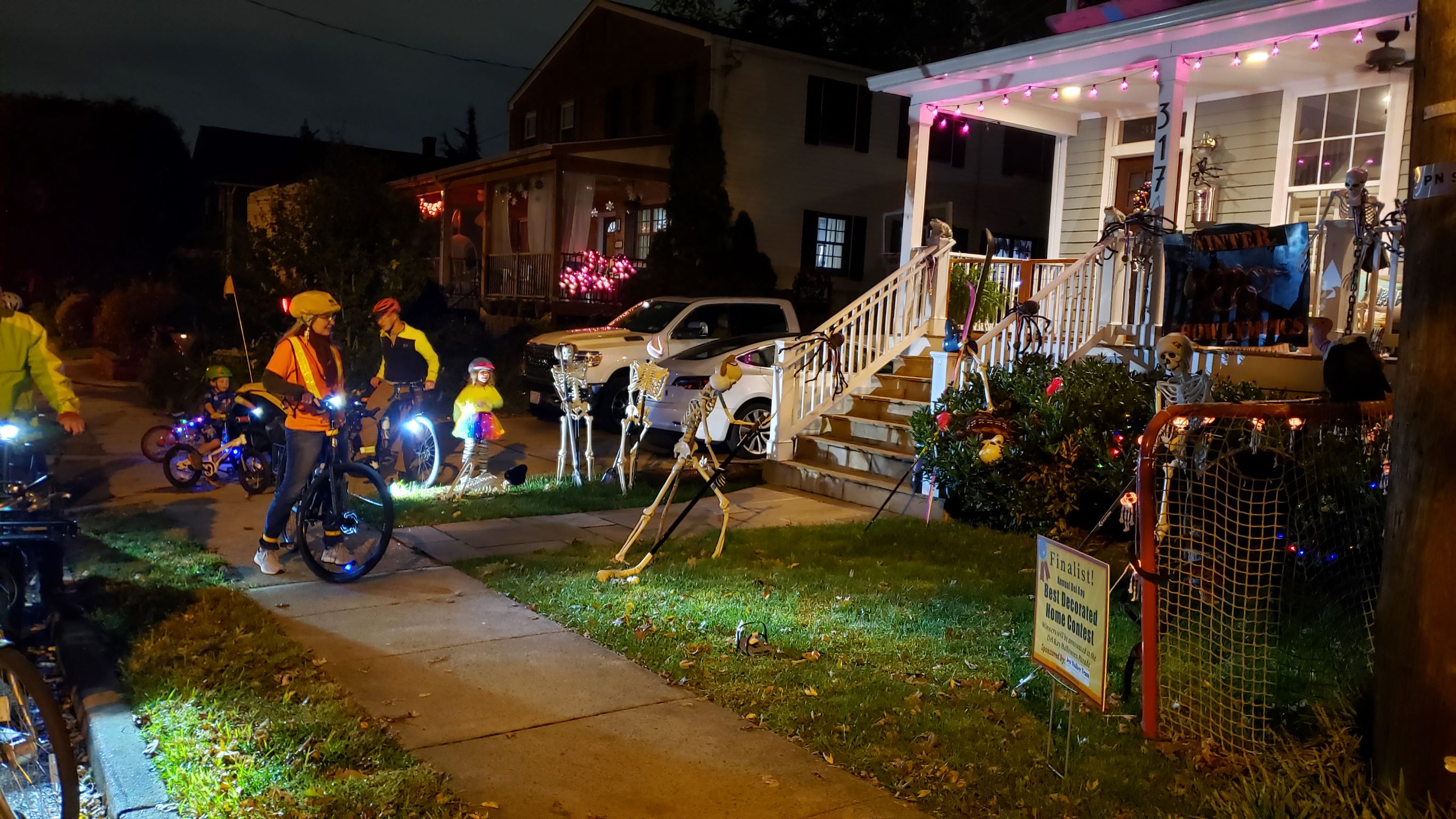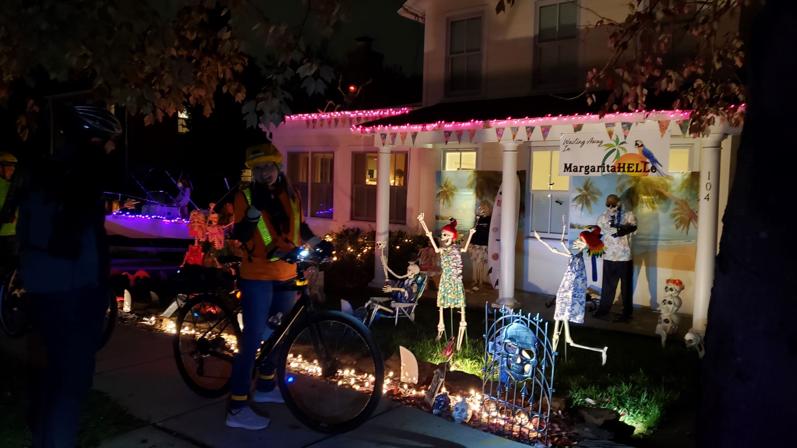 On Saturday, October 30, BPAC led a group ride to see spooky skeletons, friendly ghosts, haunted playgrounds, and other Halloween decorations in Del Ray. About fifty people — and one intrepid dog in a handlebar seat — did a five-mile loop through the neighborhood, oohing and aahing at the decorations along the way. It was a particular joy to ride with so many kids: kids in trailers, kids on the back of longtail bikes, and kids riding their own bikes. One person also joined us on rollerblades, which may be a first for BPAC rides!