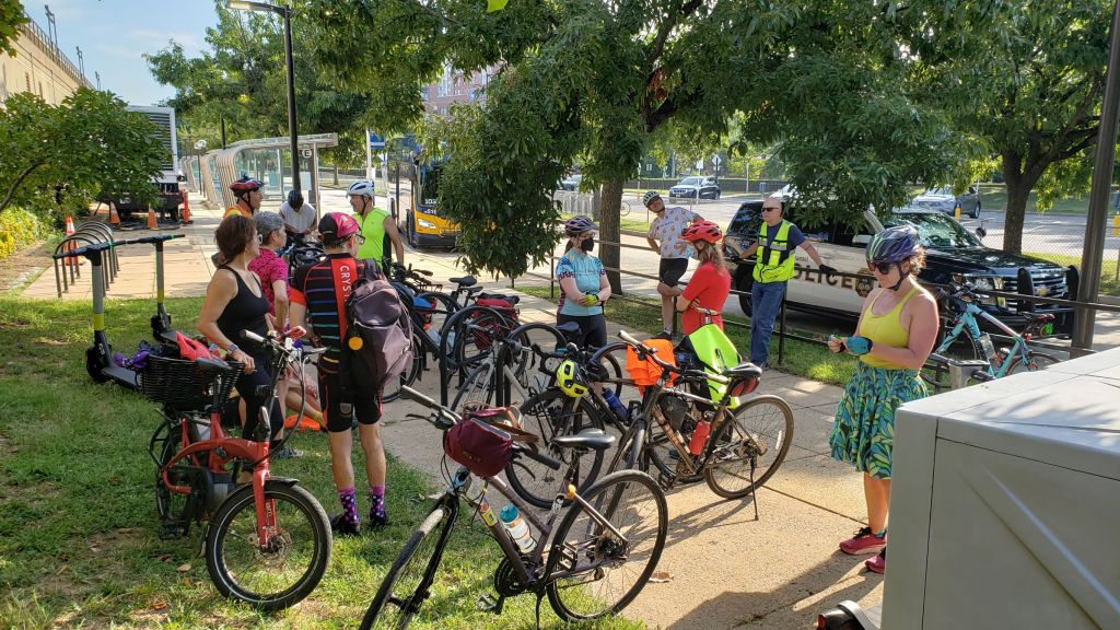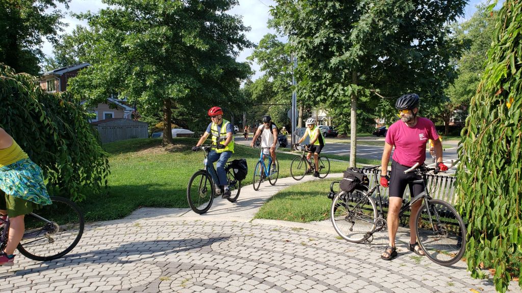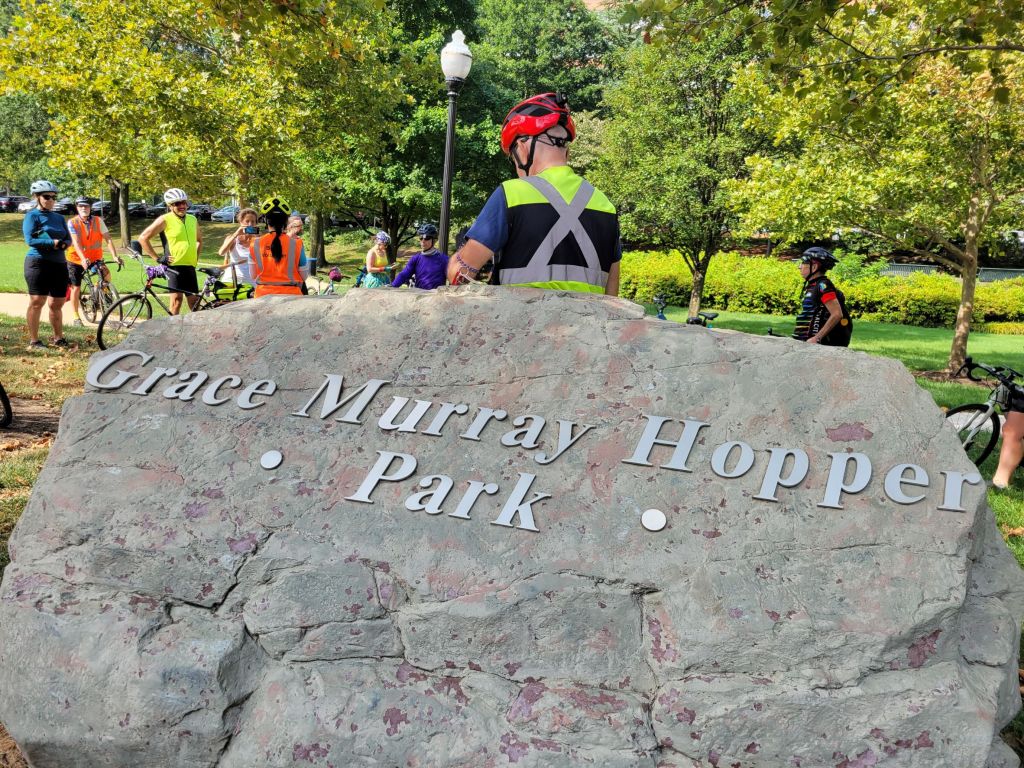 About twenty people gathered on a warm summer morning for a six-mile ride from the Braddock Road metro station to Pentagon City. Along the way, we stopped near Annie Rose Avenue in Potomac Yard and celebrated Annie Rose’s dedication to the community. We discussed Patsy Ticer, Alexandria’s first female mayor, and Cora Kelly, who devoted 53 years of her life to teaching Alexandria youth. While pausing in Judy Lowe Neighborhood Park to honor the legacy of the “First Lady of Del Ray,” we also talked about Pat Miller’s tireless work on behalf of the Del Ray neighborhood. We learned why Alexandria maintains a park named after community activist Shirley Tyler, and why Arlington maintains a park named after trailblazing computer scientist Grace Murray Hopper. And we talked about the Little Tea House Restaurant, started by suffragist-turned-entrepreneur Gertrude Crocker.