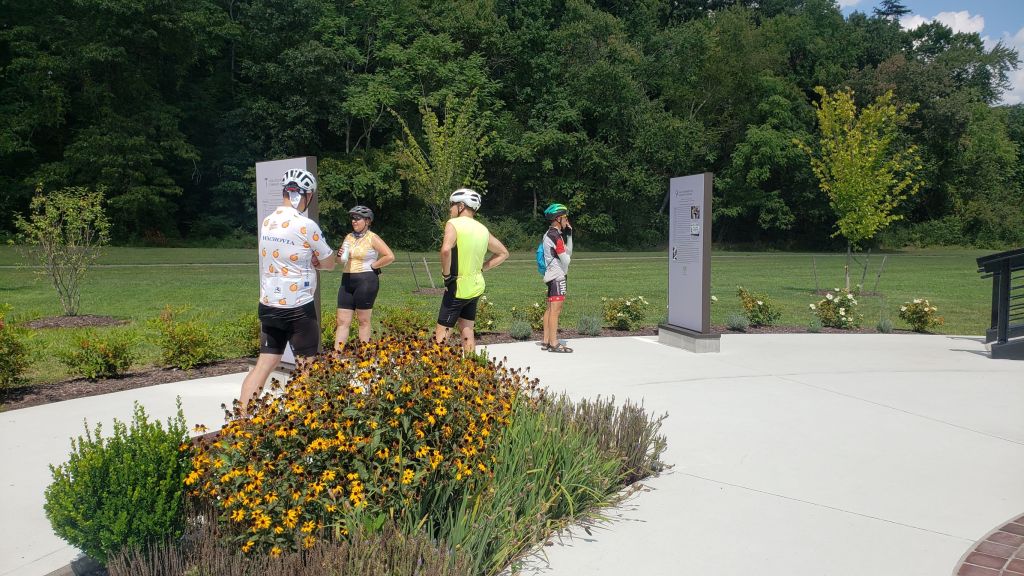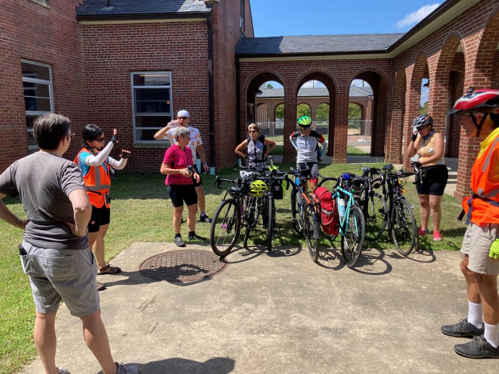 Some of the riders then took the metro to the Franconia-Springfield station, where we met up with two more people. This smaller group rode to Lorton to visit the Lucy Burns Museum at the Workhouse Arts Center and the Turning Point Suffragist Memorial. These sites honor the suffragists who were imprisoned here in 1917 and discuss how their imprisonment changed the course of the women’s suffrage movement.