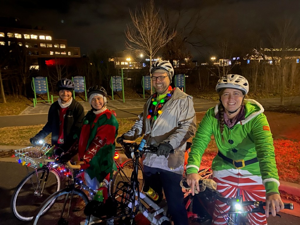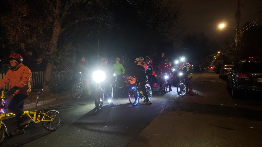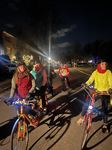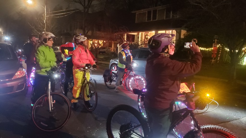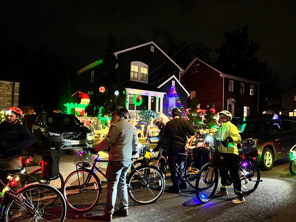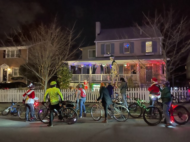 On Friday, December 16, and Saturday, December 17, BPAC teamed up with the Alexandria SpokesWomen for our twelfth annual Alexandria holiday lights ride + walk. By bike and on foot, we admired the holiday decorations and festive lights in the Del Ray neighborhood. The creativity displayed on “Christmas Card Lane” on E. Luray drew “oohs” and “aahs.” We also went by some longtime favorites such as the houses at 409 E. Nelson, 107 Stewart, and 323 E. Oak.